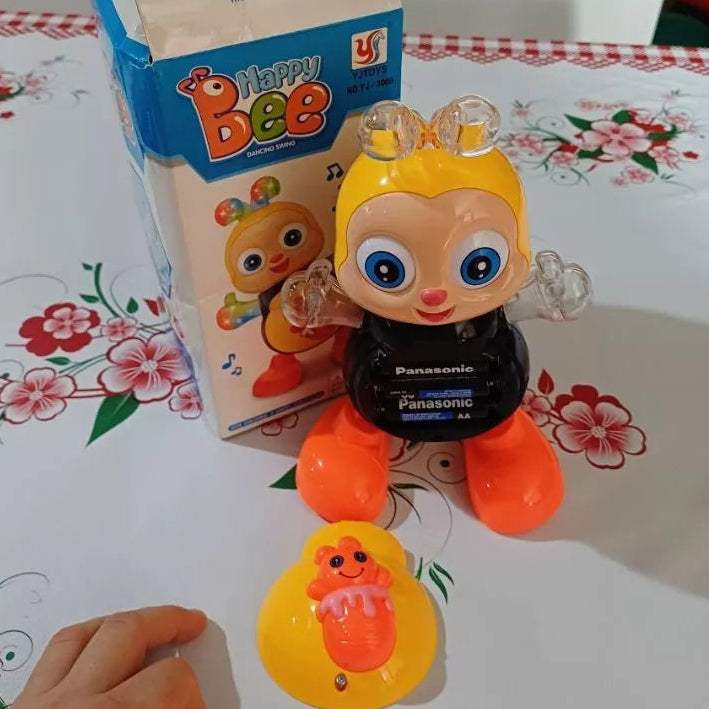 Ao ligar, a Abelita começa a cantar e dançar, criando um momento mágico de brincadeira.